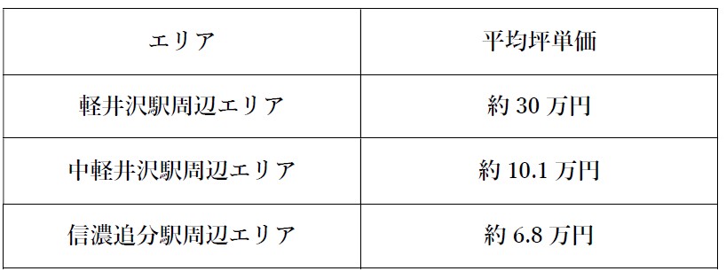 土地価格は軽井沢駅周辺が高く、軽井沢駅・信濃追分駅周辺が比較的安くなっています。さらに、どのエリアでも駅から3,000m以上離れた土地では、安価になる傾向がありました。価格を抑えて広い土地を手に入れたい場合は、軽井沢駅・信濃追分駅周辺エリアや駅から離れた場所を検討してみてください。