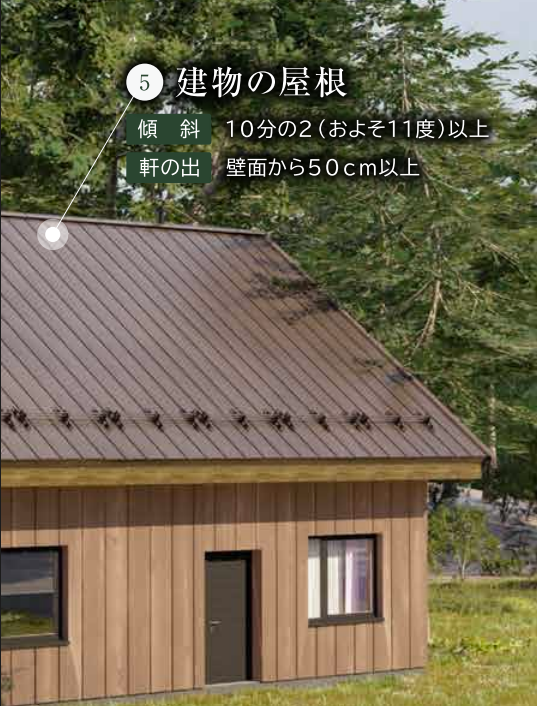 屋根の角度(傾斜)については約11度以上にする規定があります。また反対に急角度過ぎても景観を壊すという意見もあり、角度の上限についても議論されています。