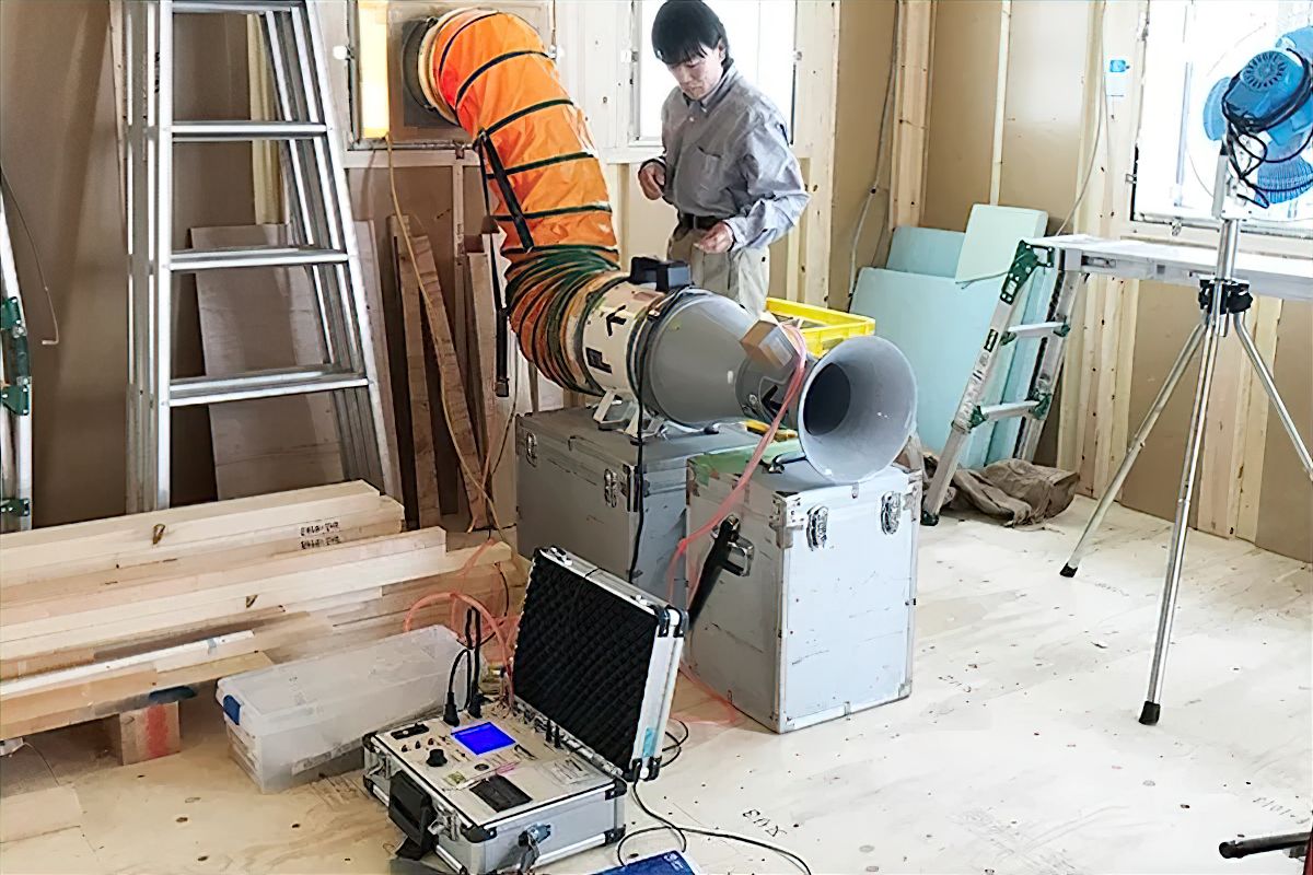 断熱と併せて重要なのが、建物の気密性です。気密性はC値というもので表され、家の延床面積に対する「隙間面積」の割合を示す数値です。この値がゼロに近いほど気密が高く、ゆえにエネルギーのロスがなくなるので、光熱費を抑えることができます。グラントモノでは全棟気密測定を行い、0.5㎠/㎡以下を基準としています。
