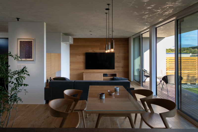 ゆったりとした奥行きの、軒のあるデッキスペースは、のどかな風景を楽しめるアウトドアリビングとして活躍。