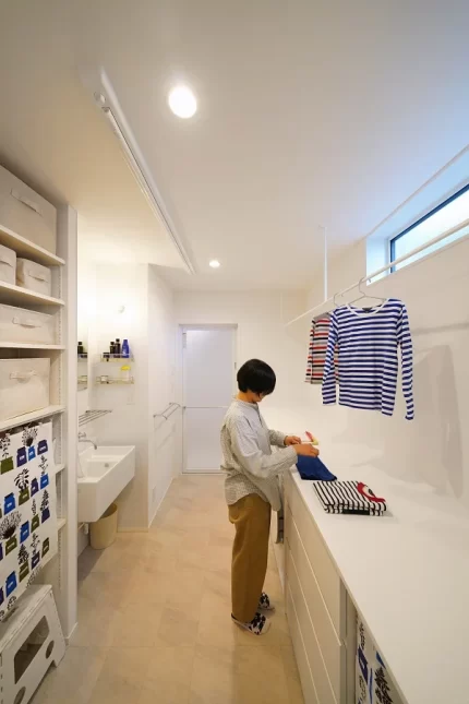 プランは、効率的な家事動線が最優先で、最小限の動きで料理と洗濯がはかどるよう工夫を凝らしました