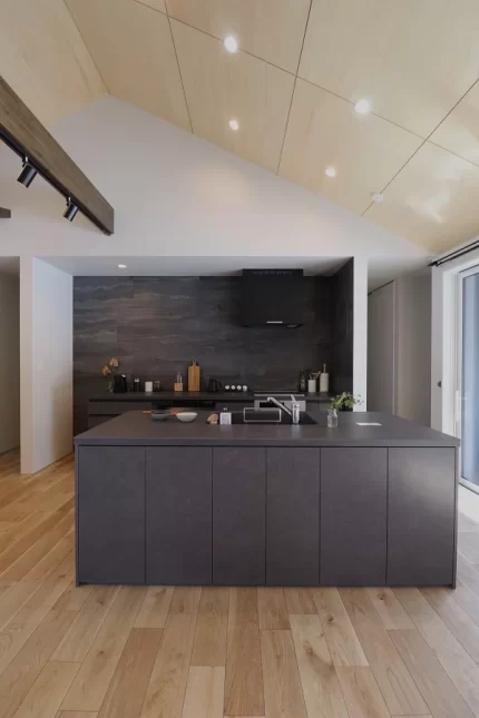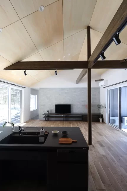 屋根空間を利用した勾配天井のリビングは、シナベニアを張ることでより一層高さが強調され、木目の美しさと木のぬくもりを感じることができます。