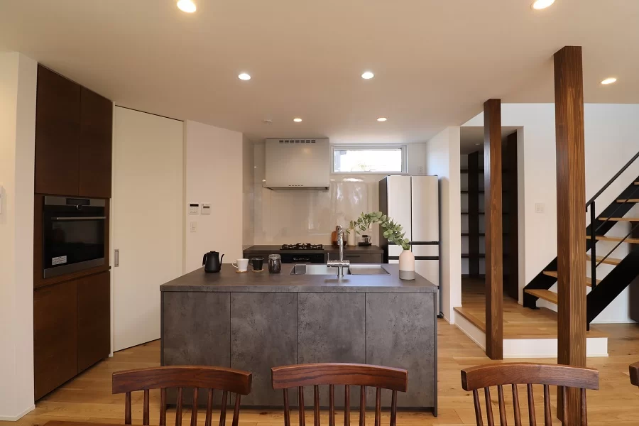 LDKには薪ストーブと、幅3mの大きなダイニングテーブルがあります。